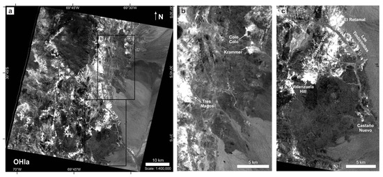 The OHIa is a better and more useful index than OHIb for detecting alteration in the study area (Figure 10). The areas where it is more likely to find phyllosilicates are highlighted in white and correspond to the Castaño Viejo NNE alteration zone that goes from Valenzuela Hill to El Retamal and the more restricted Castaño Nuevo alteration zone (Figure 10c). To the north of Castaño River, the phyllosilicate-rich zones associated with El Retamal, Las Timbirimbas, Tres Magos, Krammer and Colo-Colo are highlighted white (Figure 10b,c).