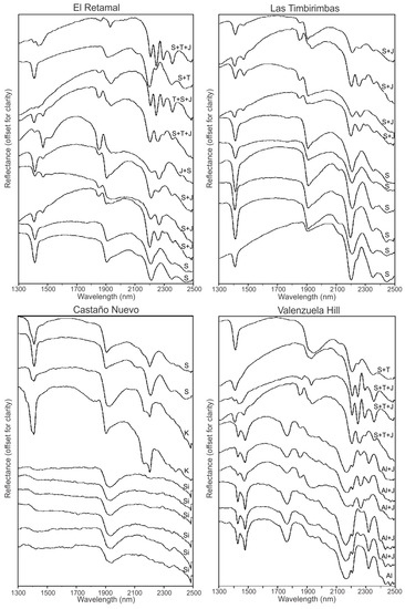 - Spectra published by Delendatti and Bastías (2001) and Delendatti (2003) [20,41], collected with PIMA-SP™ for the Castaño area. This instrument was made by Integrated and Spectronics Pty. Ltd., Australia. It measures signals from 1300 to 2500 nm wavelength. Despite PIMA having a circular window of 1 cm diameter, the measured area is a strip of 1 × 0.2 cm. To produce a spectrum it takes approximately 25 s to measure a spot and 25 additional seconds to measure an internal standard [45]. Delendatti and Bastías (2001) published a series of reflectance PIMA spectra for the most commonly detected hydrothermal mineral assemblages at El Retamal [41]. Delendatti (2003) expanded the available reference data with reflectance SWIR spectra for pure minerals and mineral assemblages at El Retamal, Las Timbirimbas, Castaño Nuevo and Valenzuela Hill [20].