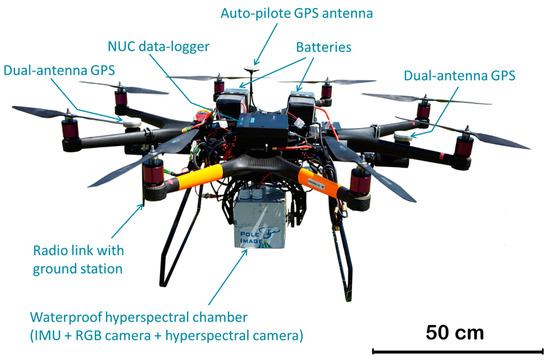 Hyper-DRELIO therefore attempts to find certain trade-offs between vehicle mass and payload, ground coverage, spatial resolution, and spectral resolution. This system is composed of an octocopter UAV platform, equipped with commercially-available sensors: a light pushbroom scanning hyperspectral sensor, a light RGB camera, and a Global Navigation Satellite System—Inertial Navigation System (GNSS-INS).