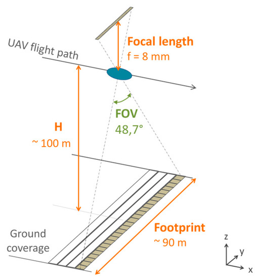 The acquisition frame rate is adjustable and defined according to the flight parameters. Considering a UAV speed of around 3–4 m/s, close to the lower bound for platform stability (typical flight characteristics are given in Section 3.1), the frame rate is generally set to 50 Hz, so as to optimize ground coverage while keeping the pixel size small and limiting along-track pixel elongation.