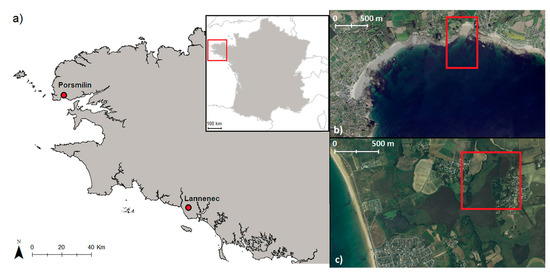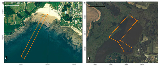In this study, we present data collected at two sites (Figure 5a): (i) a coastal location, Porsmilin Beach (Brittany, France—Figure 5b) and (ii) a small inland water body, Lannénec Pond (Brittany, France—Figure 5c). For these surveys, the reference coordinate system is RGF93—Lambert 93.
