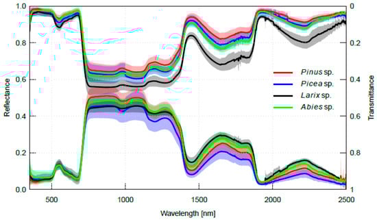 Similarity of species belonging to same taxonomic genera has been demonstrated [11,26]. Of individual species, Larix sp. clearly stands out (Figure 1, and [11]) with its spectra resembling those of broadleaved trees. This is logical because Larix sp. are deciduous, and differ also morphologically from the evergreen species. Because many of the reviewed studies focused on limited wavelength ranges (Appendix A), very little is known about best wavelength regions to separate coniferous species. Typically, the interspecies differences increase towards longer wavelengths, and are the largest in SWIR region [11]. Among principal components derived from the spectra, species explained largest amount of variation in the component that was correlated with SWIR region [34].