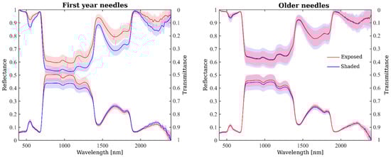 A few coniferous species (e.g., Larix sp.) shed their needles every year, but most of the species retain their needles for several years. The average lifespan, defined as the leaf age-class retaining at least 50% of leaves, varies for coniferous species from 6 to 110 months [46]. Spectral differences within coniferous crowns are mainly observed (1) between needles of different age, and (2) between vertical canopy layers with different levels of adaptation to direct/diffuse radiation conditions [11,17,27,47]. For example, current-year Norway spruce needles collected from a study site in the Czech Republic (see Appendix B for details) show the largest spectral differences between two vertical canopy levels, whereas older cohorts of needles exhibit almost no differences in their spectral properties (Figure 2). The wavelengths that are the most influenced by needle age are located in the green peak region, as well as in NIR and SWIR regions, where transmittance of shade-adapted needles is higher than that of sun-exposed needles. Needle reflectance is less influenced than transmittance by needle age. Measurements of spectral properties of 13 boreal broadleaf and 12 coniferous tree species also revealed that shaded foliage in general had higher transmittance than sun-exposed foliage throughout the 400–2400 nm spectral region (being the most prominent in NIR and SWIR regions) [11]. Canopy position, however, explained only a relatively small proportion (<10%) of the overall variability in the measured spectra for the 12 coniferous species. Needle age (current-year vs. previous-year needles), on the other hand, explained up to 37% of the total variance in measured transmittance for the same set of species. In addition, canopy position, and thus light environment, had a relatively small influence on needle spectra [11], which is in line with other studies that have emphasized importance of species and needle age over light environment [17,47]. On the other hand, in another study limited to three species, larger differences in coniferous needle reflectance were indeed observed between canopy positions [27]. Reasons for these somewhat contradictory findings may be differences in forest structures and/or definitions of canopy positions between studies, and the fact that the statistical analysis in the study comprising 12 species [11] did not consider interaction effects by canopy position, needle age, and species. Overall, the effect of canopy position is well documented in literature, but its magnitude in relation to other factors (e.g., species, needle age, site type) is still uncertain.