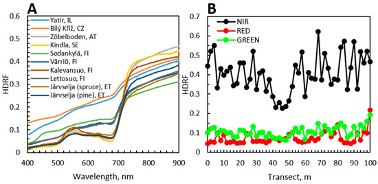 (A) The understory spectra of various coniferous forest stands. HDRF = Hemispherical-directional reflectance factor measured by a field spectrometer. (B) Variation of HDRFs corresponding to MODIS channels GREEN (545–565 nm); RED (620–670 nm); NIR (842–875 nm) along a 100 m long transect at Kalevansuo site, Finland in June 2017.