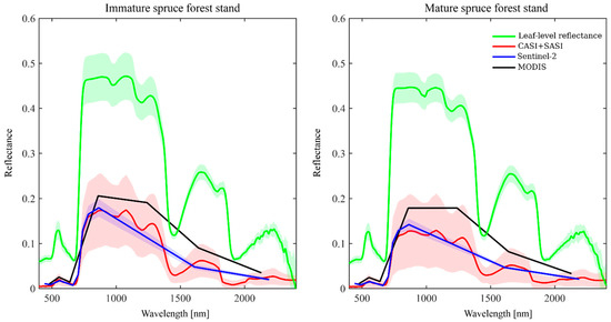 The highest spruce reflectance is observed for needle-level measurements with average reflectance in NIR-plateau around 1000 nm between 0.4 and 0.5. In NIR wavelengths, also, the standard deviation of measured needle reflectance is the highest (±0.07 in absolute units), whereas at visible and SWIR wavelengths, the variation is low (±0.01 in absolute units). Both airborne and spaceborne observations of top-of-canopy reflectance exhibit similar magnitudes of reflectances, having an NIR reflectance of 0.12 for mature spruce stand, and 0.18 for immature spruce stand. From the three remote sensing instruments, airborne hyperspectral data of joint CASI and SASI sensors (with the highest spatial resolution) had the highest within-plot variability. By contrast, the stand variability obtained by Sentinel-2 sensor is very low, but the mean reflectances are comparable to airborne data of CASI and SASI, in particular, in the red-edge spectral region. The individual pixels of MODIS nadir-normalized product showed the highest reflectance among the three studied remote sensing instruments, especially in the infrared spectral region. Possible explanations for this phenomenon may be the lower spatial resolution of MODIS, resulting in mixed pixels of reflectances originating from different land cover types and the radiometric calibration of the instruments.