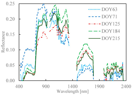 An example of seasonality of coniferous forests’ spectra. Seasonal variation in Scots pine canopy hemispherical-directional reflectance factors (HDRF) at SMEAR II station (Hyytiälä, central Finland) as measured by the EO-1 Hyperion sensor on 3 March 2012 (Day of Year, DOY = 63), 11 March 2012 (DOY = 71), 5 May 2010 (DOY = 125), 3 July 2010 (DOY = 184), and 3 August 2011 (DOY = 215). The imagery was corrected radiometrically (for the striping and spectral smile effects) and atmospherically (using the FLAASH algorithm implemented in ENVI by Harris Geospatial, Inc. See [103] for details. The atmospheric absorption bands near 950, 1400, and 1900 nm were removed. The spectrum includes noticeable noise, especially at longer wavelengths, and negative values for wavelengths below 450 nm (blue to violet light), caused by the low signal to noise ratio and decreasing performance of the ageing experimental instrument.