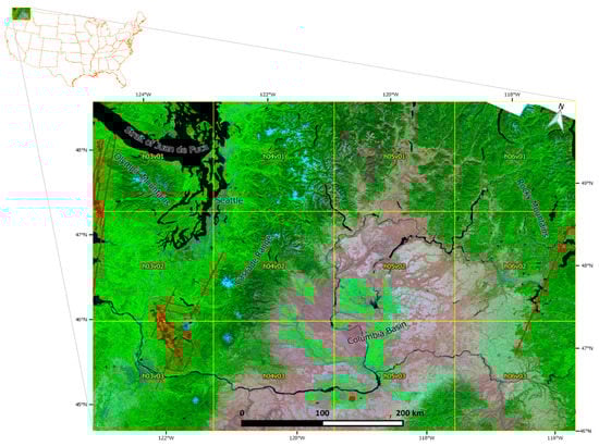 Study area over Washington State, USA, encompassed by 12 Landsat Analysis Ready Data (ARD) tiles (yellow outlines, top left: h03v01, bottom right: h06v03) each composed of 5000 × 5000 30 m pixels. The missing data on the northern border of the northeast tile (shown as white) are from Landsat images acquired only over Canada and so are not processed as ARD. To provide geographic context, the background shows the 5-year median of the Landsat 5 Thematic Mapper (TM) and Landsat 7 Enhanced Thematic Mapper Plus (ETM+) band 5 (red), 4 (green), 3 (blue) atmospherically corrected ARD metrics. The red colors show the Goddard LiDAR, Hyperspectral & Thermal Imager (G-LiHT) acquisition flight paths.