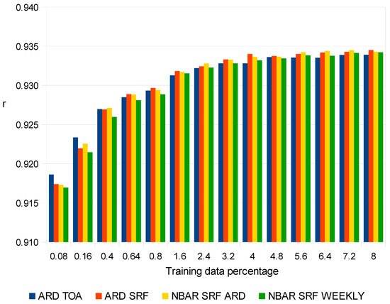 Figure 2 and Figure 3 show Pearson’s correlation coefficient (r) and the root mean square error (RMSE) accuracy results, respectively. The two accuracy metrics reveal similar results. The mapping accuracy increased as more training data were used. The correlations were all significant (p < 2.2 × 10−16) and increased from 0.9186 (ARD TOA), 0.9174 (ARD SRF), 0.9173 (NBAR SRF ARD), and 0.9169 (NBAR SRF WEEKLY) using the smallest (0.08%) amount of training per tree to 0.9339, 0.9345, 0.9343, and 0.9342, respectively, when the greatest amount (8%) of training per tree was used. Similarly, the RMSE values decreased from 15.29% (ARD TOA), 15.41% (ARD SRF), 15.42% (NBAR SRF ARD), and 15.48% (NBAR SRF WEEKLY) with the smallest (0.08%) amount of training per tree to 13.86%, 13.79%, 13.82%, and 13.81%, respectively, when the greatest amount (8%) of training per tree was used.