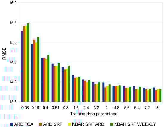 Root mean square error (RMSE) accuracy results derived as (2) for the four data processing levels using top of atmosphere ARD (TOA ARD), atmospherically corrected ARD (SRF ARD), BRDF adjusted atmospherically corrected ARD (NBAR SRF ARD), and weekly composited BRDF adjusted atmospherically corrected ARD (NBAR SRF WEEKLY). The results considering an increasing percentage of the training data are shown.