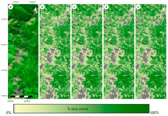 Detailed 7 × 21 km subset centered at 48°35′49.48″N, 118°28′8.25″W (Sherman Peak and surroundings, WA) of (a) the 5-year median of the Landsat 5 TM and Landsat 7 ETM+ band 5 (red), 4 (green), 3 (blue) atmospherically corrected ARD metrics (from Figure 1), mapped percent tree cover 30 m derived using 8% training per tree and 50 multi-temporal metrics extracted from (b) top of atmosphere ARD (TOA ARD); (c) atmospherically corrected ARD (SRF ARD); (d) BRDF adjusted atmospherically corrected ARD (NBAR SRF ARD); and (e) weekly composited BRDF adjusted atmospherically corrected ARD (NBAR SRF WEEKLY).