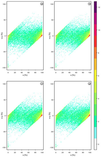 Percent tree cover estimation errors (v–y) plotted as a function of percent tree cover (v) where y is a regression tree estimated value and v is the corresponding validation data value, considering all 67,837 validation reference pixels; the plot colors show the frequency of occurrence of similar error values with a log2 scale. The results are shown for the percent tree cover maps derived using 8% training per tree and 50 multi-temporal metrics extracted from (a) top of atmosphere ARD (TOA ARD); (b) atmospherically corrected ARD (SRF ARD); (c) BRDF adjusted atmospherically corrected ARD (NBAR SRF ARD); and (d) weekly composited BRDF adjusted atmospherically corrected ARD (NBAR SRF WEEKLY).
