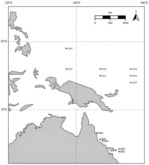 Near-surface temperatures are measured in the tropics by thermometers of the Global Tropical Moored Buoy Array, which, in the Tropical Western Pacific Ocean, comprises the Triangle Trans-Ocean Buoy Network (TRITON; [29]). This is a deep-water mooring array, and so does not extend into the shallow waters where the corals are found. In contrast, temperature measurements have been made by the Australian Institute of Marine Science (AIMS) for many years by self-recording thermometers deployed at the coral depths by divers. These measurements are very good indicators of the thermal stress experienced by the corals and, being recorded during our analysis period with a 10-min resolution, provide data that resolve rapid changes, such as those associated with diurnal heating [30]. However, they are relatively sparse in space, and the data loggers have to be recovered before the temperatures can be analyzed.