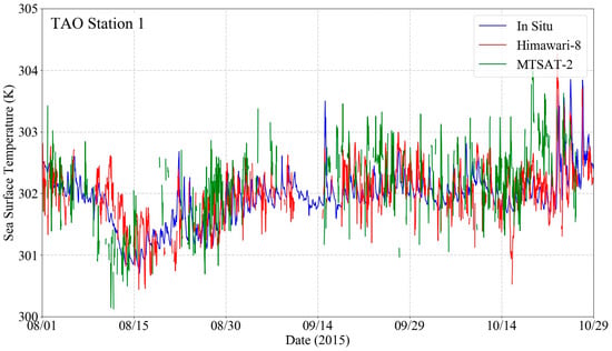 The comparison between the satellite-derived SSTs and the subsurface temperatures show better agreement in the mean for the Himawari-8 AHI SSTs in the areas of both the western TAO array and GBR. For the SST derived from both MTSAT-2 and Himawari-8, results show that the variation within the SST differences decrease during the night. For night-time measurements, the Himawari-8 AHI SSTs show better agreement in the area of the western TAO array. Though the standard deviation of the temperature differences for the MTSAT-2 is smaller than the Himawari-8, the Himawari-8 AHI SSTs are in general more accurate at night. Overall, Himawari-8 shows a mean SST difference of 0.18 K for all stations, while MTSAT-2 shows a mean difference of 0.26 K. The most reduced discrepancy was 0.17 K at GBR Station 4 for the Himawari-8 AHI SSTs. Differences between the stations can be related to the proximity to land, and the depth of the in situ measurement.
