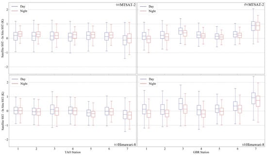 The statistics of the differences between the satellite-derived SST and the in situ temperatures for each of the TAO and GBR stations are shown in Table 4. The statistics of the differences between the satellite-derived SSTs for the Himawari-8 and MTSAT-2 for the entire data set used here are shown in Table 5, and for day and night conditions at the two sets of in situ measurements in Table 6. In general, the mean and median values of the differences are smaller for the Himawari-8 AHI SSTs compared to those of MTSAT-2, but there are exceptions. The standard deviations of the differences do not show the expected improvements in Himawari-8 AHI SSTs compared to those of MTSAT-2, especially at the GBR stations; these are shown graphically in Figure 2 as box-whisker plots. The central bar in the box indicates the median value, and the lower and upper borders of the box represent the first and third quartiles of the distribution of values; the extreme values of the whiskers are the minimum and maximum values, excluding outliers. Outliers were considered those to be beyond 1.5 times the upper and lower quartiles, and are not shown in this and other figures.