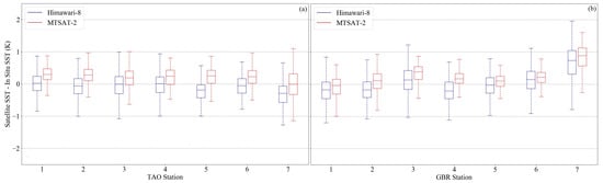 Box plots for the temperature difference between the satellite-derived SST and subsurface temperature at each TAO mooring (a) and GBR station (b). Blue boxes and whiskers represent the temperature differences for the Himawari-8 SSTs. Red represents the temperature differences for the MTSAT-2 SSTs. Outliers are not plotted.