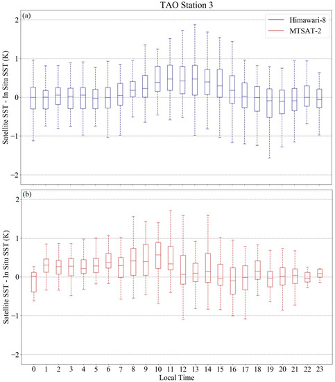 Box plots of the hourly differences between the satellite-derived SSTs and the subsurface temperatures measured at TAO Station 3 at 2°N, 137°E. Differences of SSTs from Hiawari-8 are shown in blue in (a), and from MTSAT-2 in red in (b). Outliers are not plotted. The data are of best quality level from 1 August 2015–31 October 2015.