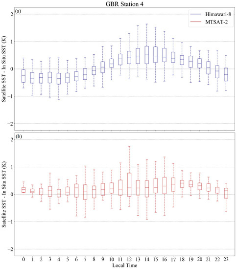 A possible cause of a bimodal distribution in the differences between satellite-derived SSTs and the subsurface temperatures is diurnal heating, and strong diurnal signals in the discrepancies of SST from both satellites are apparent as many stations. Figure 7 shows box-whisker plots of the discrepancies at TAO Station 3, which is quite typical of data from the TAO stations. The characteristics of the discrepancies with Himawari-8 SSTs are better behaved than the comparisons using MTSAT-2 SSTs, in that the pattern is less variable in the median, but the negative median error in the evening and early part of the night is unexpected. The negative median discrepancies in the Himawari-8 comparisons, are more pronounced at the GBR Station 4 (Figure 8).