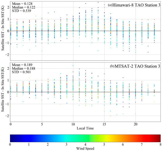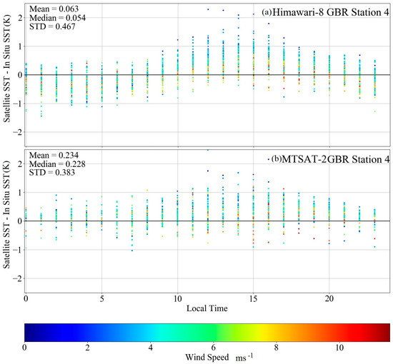 Large temperature differences occurred when there were low wind speeds during the time of the highest insolation around local noon (Figure 9 and Figure 10). This is related to the thermal stratification within the upper ocean. For wind speeds >6 ms−1, the variation within the temperature differences decreased, approaching 0 K, presumably because higher wind speeds mix the upper part of the water column, decreasing the change in the temperature between the SST and the temperature at the depth of the in situ measurements. When the water is well mixed, the difference between measurements will be smaller; making the satellite derived SSTs closer to the in situ measurements and decreasing the discrepancies. SSTs were separated by day and night time to assess the effects of diurnal heating. For Himawari-8, the median temperature difference for each station is generally close to 0 K. The standard deviations in the discrepancies decreased for both satellites at all stations during the night compared to during the day. When comparing night-time differences for both satellites, there is a smaller variation seen within the MTSAT-2 for all in situ stations. Both satellites show better results when the diurnal heating effect is eliminated during the night-time samples and for wind speeds >6 ms−1.