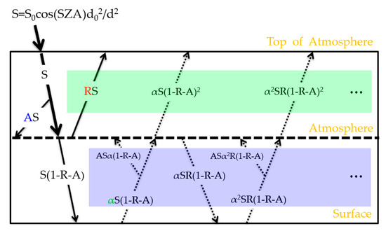 The theoretical background of RSR is shown in Figure 1. In this figure, the solid line is the primary absorption and reflection path of the shortwave radiation (extraterrestrial solar irradiation) incident on the atmosphere, and the dotted line shows the multiple scattering process by the surface and atmosphere [33]. RSR is green-shadowed in this schematic. It was approximated by using an infinite geometric series, as shown in Equation (1), because atmospheric reflection (R) times surface albedo (α) is less than 1 (αR < 1) [34]. In Equation (1), the solar constant (=1361 Wm−2) [35] and the SZA [36] are calculated by the theoretical equation in the previous study, however, TOA albedo can be retrieved using the narrowband reflectance of each CH and regression coefficients, as expressed by Equation (2) [11,13,14,15].