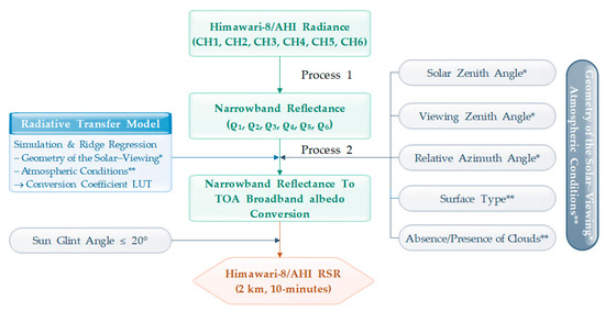 Since the 1970s, many studies have been measuring and analyzing RSR using radiative transfer models and satellite-based broadband or narrowband sensor data. However, radiative transfer models require prioritization of numerical experiments based on input data, and they are time consuming because calculation for each lattice is inevitable [7,8]. In addition, studies using broadband sensor data are limited to those on local radiation budget studies because broadband sensors such as National Aeronautics and Space Administration (NASA)’s the Earth Radiation Budget Experiment (ERBE) [9] and Clouds and the Earth Radiant Energy System (CERES) [10], which are mounted on polar orbiting satellites, provide data at resolutions over 20 km. These sensors are not suitable for analyzing the spatial and temporal distribution of RSR [11] because air pollution (natural or anthropogenic), urbanization, and forest fires in small areas cannot be easily detected using their data. In general, the RSR method using a radiation transfer model and broadband sensor data from polar orbit satellites provide higher accuracy than narrowband sensors, but the analysis of spatial and temporal changes is limited. In contrast, narrowband sensor data from geostationary satellites provide superior temporal and spatial continuity. For narrowband sensor data, the reflectance for each channel (CH) is assumed to be isotropic, which means the ratio of shortwave radiation is incident to the atmosphere and irradiance observed from the satellite. However, because isotropy is not satisfied in actual atmospheric conditions (surface type, water vapor, etc.), it is corrected using a radiative transfer model and a broadband sensor [12]. The relationship between the reflectance of a narrowband sensor and TOA albedo [11] and the narrowband reflectance and the RSR are affected [13] by solar zenith angle (SZA), viewing zenith angle (VZA) and relative azimuth angle (RAA) [14], surface type [15], and anisotropy [16,17].
