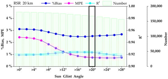 Because RSR significantly varies from clear skies to deep convective clouds (0 to 80%) [18], the case of 15 October 2015 was selected, with the accompanying precipitation and typhoons (KOPPU: 16.0°N, 138.8°E, and CHAMPI: 13.3°N, 158.2°E). Figure 3 shows the result of statistical analysis of R2, %Bias and MPE according to SG as an example of 15 October 2015 for the calculation of a proper angle for SG removal. As shown in this figure, R2 between Himawari-8/AHI and Terra/CERES was changed from 0.919 to 0.923 and %Bias from 3.11% to 2.53%. The MPE of Himawari-8/AHI and Terra/CERES decreased with increasing sun reflection angle, which was less than 0.74% when the SG was 20°. In this study, sun reflection angles less than 20° were considered as SG.