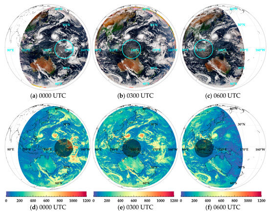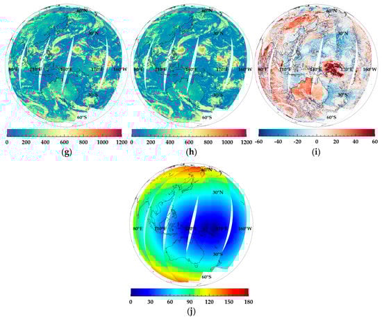 Figure 4 shows Red–Green–Blue (Blue: CH1, Green: CH2, Red: CH3, RGB) composite images (Figure 4a–c) and RSR (Figure 4d–f) of Himawari-8/AHI analyzing scene error according to SG. In this figure, the black circles (transparency = 50%) represent SG areas (≤20°). Figure 4g–j shows the RSR, percentage error, and SG of Himawari-8/AHI and Terra/CERES, respectively, with space-time agreement. In the RGB composite images in Figure 4a–c, SG appears brighter than the surrounding pixels of the mid-latitude ocean. This corresponds to the RSR pictures in Figure 4d–f. The MPE of Himawari-8/AHI and Terra/CERES was more than 45% (Figure 4i) and the SG angle was less than 20° (Figure 4j). In other words, when the SG area is removed, R2 between AHI and CERES is 0.919, which is larger than 0.923, and this result is consistent with the result of [17].
