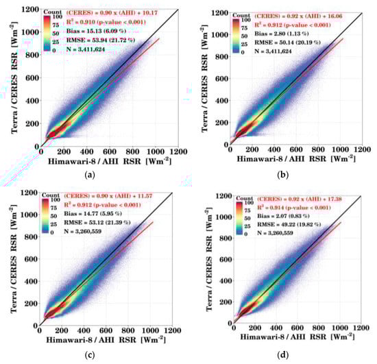 Lee et al. [23] retrieved TOA albedo assuming narrowband reflectance to be isotropic. In this study, RSR was retrieved by considering anisotropy of the narrowband reflectance by the surface and the atmosphere, and by removing SG. The results are shown in Figure 5. This figure shows the results of RSR of this study. Isotropic, anisotropic, and SG effects of narrowband reflectance were analyzed using the Himawari-8/AHI data (all data: 3,411,624 pixels). Figure 5a is a two-dimensional histogram (2D histogram) of the Terra/CERES data, with RSR retrieved assuming the narrowband reflectance to be isotropic Lee et al. [23] (OLD). Figure 5b,c shows the RSR considering anisotropy of the narrowband reflectance (OLD2)and the case of removing SG (OLD3), respectively. Figure 5d considers Figure 5b,c together; similar to Figure 5a, Figure 5b–d shows scatter plots along with Terra/CERES data. R2 between RSR retrieved using the Himawari-8/AHI and Terra/CERES data was 0.910 when the narrowband reflectance was assumed to be isotropic as shown in Figure 5a. The Bias and RMSE were 15.13 and 53.94 Wm−2, respectively. However, in this study, R2 between Himawari-8/AHI and Terra/CERES considering narrowband reflectance as anisotropy was 0.912, which is higher than that in Figure 5a. Furthermore, the Bias and RMSE were 2.80 and 50.14 Wm−2, respectively, showing improvements compared to Figure 5a. Comparing Figure 5a,c, R2 values are similar, but Bias and RMSE improved slightly. The narrowband reflectance was considered to be anisotropic and SG was removed simultaneously (NEW). Comparing Figure 5a,d, R2 (0.914), Bias (2.07 Wm−2) and RMSE (49.22 Wm−2) were significantly improved. These results are in good agreement with the results of [17], where R2 values between Meteosat RSR and ScaRaB RSR were found to be 0.845 and 0.863, respectively, for isotropic and anisotropic calculations.