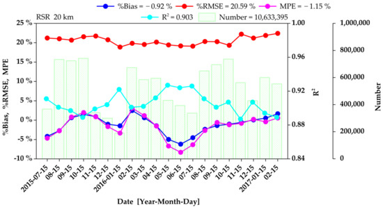Statistical analysis of RSR using Himawari-8/AHI and Terra, Aqua, and S-NPP/CERES data for the 15th day of each month from July 2015 to February 2017 (%Bias: blue dotted line; %RMSE: red dotted line; MPE: magenta dotted line; R2: cyan dotted line; Number: green bar chart). The legend shows the statistical results for the all case.