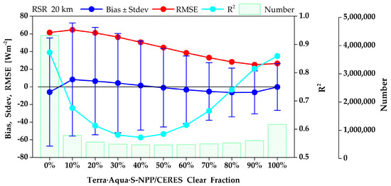 Coefficient of determination (R2), standard deviation (Stdev), Bias, and RMSE of RSR using Himawari-8/AHI and Terra, Aqua, and S-NPP/CERES for the clear fraction for all cases. The bar graph shows the number of data.