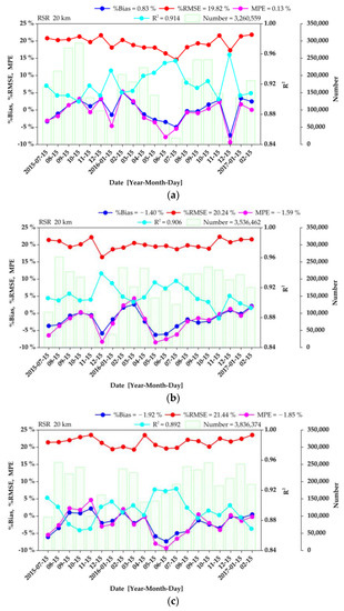 To analyze the detailed results according to the validation data of the Figure 6, the statistical analysis results of the three data sets (Terra, Aqua, and S-NPP) are shown in the Figure 8. Bias (%Bias), RMSE (%RMSE), and MPE were improved in the order of Terra, Aqua, and S-NPP. In the case of Terra, %Bias, %RMSE, and MPE were 0.83%, 19.82%, and 0.13%, respectively, while those for Aqua were −1.40%, 20.24%, and −1.59%, and −1.92%, 21.44%, and −1.85% for S-NPP. For further analysis of these results, the data for Terra, Aqua, and S-NPP were compared to those for the overall case according to the clear fraction (Figure 9). As shown in Figure 9, the number of data for clear areas in Terra was approximately 0.24% higher than that of Aqua and S-NPP but about 0.96%, 1.40%, and 1.89% less for cloudy areas (partly cloudy, mostly cloudy, and overcast). In the previous analysis, Terra’s error was smaller than that of Aqua and S-NPP because Terra had a slightly larger cloudy area and fewer clear areas than Aqua and S-NPP.