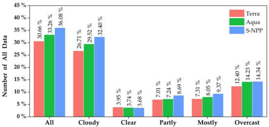 Number of Terra, Aqua and S-NPP data compared to all data according to the clear fraction. Clouds were subdivided according to clear fraction (all: 0–100%; cloudy: 0–95%; clear: ≥ 95%; partly cloudy: 50–95%; mostly cloudy: 5–50%; overcast: < 5%).