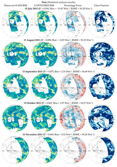 RSR (Wm−2) of Himwari-8/AHI (left) and S-NPP/CERES (middle left) retrieved using data from the 15th day of every month between July 2015 and February 2017; percentage error (%) (middle right) and clear fraction (%) (right) between Himawari-8/AHI and S-NPP/CERES data sets; R2, Bias, and RMSE (top) between the two data sets.