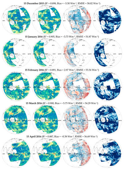 In this study, data from CERES SSF level 2 edition (Terra, Aqua: 4A; S-NPP: 1A) with a resolution of 20 km within the field of view were used for validation. CERES sensors are mounted on low orbiting satellites (TRMM: 1997/12–2015/4, Terra: 1999/12–Present, Aqua: 2002/5–Present, S-NPP: 2011/10–Present) [5,10] and provide long-term radiometric data for shortwave (0.3 to 5.0 μm), atmospheric window (8 to 12 μm), and total-wave (0.3 to 200 μm) region as part of the NASA Earth Observing System (EOS) satellite project [27,29]. Su et al. [30] compared the all-sky flux from the CERES retrieval (along-track observation) with that from the MODIS retrieval and reported uncertainties in the CERES data of 3.3% (9.0 Wm−2) and 2.7 % (8.4 Wm−2) for ocean and land areas, respectively. They further reported that the direct integration test revealed the monthly Bias and RMSE of CERES to be less than 0.5 and 0.8 Wm−2, respectively.