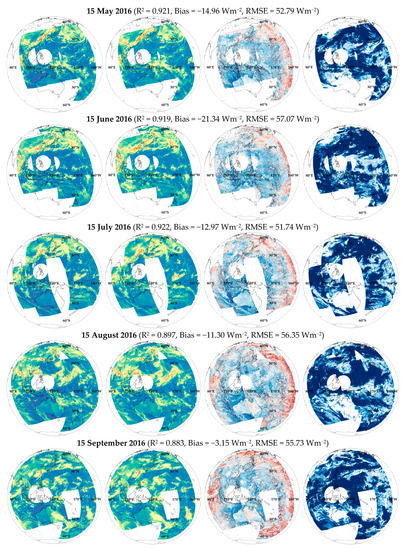 The results of this study (Himawari-8/AHI) showed improved performance of the algorithm, and the validation with Terra, Aqua, and S-NPP/CERES data also showed good results, except from 15 May to 15 July 2016. In particular, on 15 June 2016, comparing all data, the number of data in the clear areas and the cloudy area was influenced, and therefore the statistical analysis results were unsatisfactory. R2 (0.571–0.815) and RMSE (25.09–64.61 Wm−2) of the partly and mostly cloudy areas were large, which could be attributed to a space-time mismatch between AHI and CERES in the spatial resolution matching process. To further analyze these results, we divided the data into three sets (Terra, Aqua, and S-NPP). The results were better in the order of Terra, Aqua, and S-NPP, because Terra accounted for a larger number of data in the clear area and less cloud area than Aqua and S-NPP. This implies that the validation results are affected by the number of data in the clear and cloudy areas.