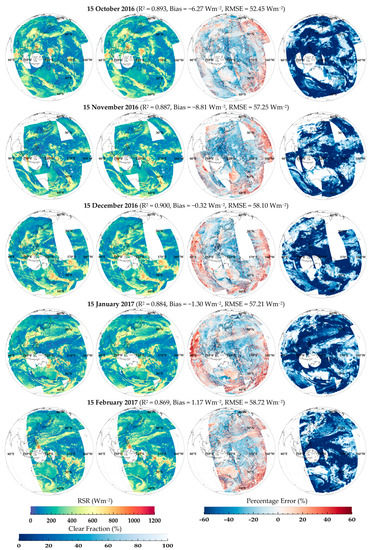 Figure 10 shows the results of scene analysis of S-NPP/CERES (36.08%) with the largest number of data among Terra, Aqua, and S-NPP for 20 cases because the S-NPP satellite observes at an altitude of 840 km, which is higher than the Terra and Aqua (705 km) [52]. Figure 10 shows the RSR of Himawari-8/AHI (left) and S-NPP/CERES (middle left), the percentage error of the two data sets (middle right), and the clear fraction of CERES (right). In this figure, RSR differs depending on the absence or presence of clouds and surface types, and the SZA increases as the latitude increases. We analyzed SZA and VZAs of less than 80° with approximately 3–5 scan line for each case. However, some cases had only 1–2 scan line due to the absence of Himawari-8/AHI data. In this figure, R2 and Bias between Himawari-8/AHI and S-NPP/CERES were 0.867–0.922, and −21.34–5.52 Wm−2, respectively, and the RMSE was 51.74–59.28 Wm−2, similar to the results of [18]. Regarding land surface albedo (0.12–0.36) for the clear area (95–100%), the RMSE of S-NPP/CERES was 14.33–41.65 Wm−2. This value is somewhat less accurate than that for the ocean (0.03–0.06, RMSE = 14.39–24.17 Wm−2), which was relatively small and constant. During the preparation of the regression coefficient LUT, surface was classified into five types (vegetation, desert, snow, ocean, and lake), whereas CERES data were classified into 20 types [46], leading to some inaccuracies. In addition, in the cloud area, the RMSE varied between 54.08 and 61.52 Wm−2, depending on the cloud properties (cloud optical thickness, cloud fraction, cloud type, etc.). Partly and mostly cloudy areas showed larger errors compared with overcast areas, particularly with increasing SZA and VZA. This can be attributed to the generation of the regression coefficient LUT using SBDART [11,53] and the actual atmospheric error assuming plane-parallel atmospheres [18]. In addition, the inability to refine the LUT according to the atmospheric conditions was considered to lead to an error; SZA (12 including 0°, 10°, 20°, 30°, 40°, 50°, 60°, 65°, 70°, 75°, 80°, and 85°), VZA (18 from 0–85° at 5° intervals), and RAA (19 from 0–180° at 10° intervals) [53]. Vermote and kotchenova [54] reported an error of 0.002 for 22 SZA and VZAs and 73 RAAs.
