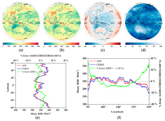 Similar to Figure 10, but for 20 km gridded mean (15 July 2015–15 February 2017) spatial distribution of RSR (Wm−2) from: AHI (a); and CERES (b); percentage error (c); and clear fraction (d). Mean RSR from AHI and CERES averaged along each latitude and percentage error on double y axis (e); and similar to but along each longitude and percentage error on double x axis (f).
