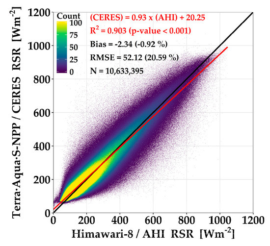 The narrowband radiance of Himawari-8/AHI and the regression coefficient LUT were applied to the algorithm in Figure 2, and the RSR was retrieved and compared with Terra, Aqua, and S-NPP/CERES data (Figure 6). For validating the method, scalar accuracy measurement and linear relationship analysis were performed. For the scalar accuracy measurement, Bias, relative Bias (%Bias = Bias/CERESMea × 100%), root mean square error (RMSE), relative RMSE (%RMSE = RMSE/CERESMean × 100%) and mean percentage error (MPE = ((AHI-CERES)/CERES) × 100%) of Terra, Aqua, and S-NPP/CERES were calculated [49]. In addition, Pearson correlation coefficients [50] and significance level [51] were calculated through correlation analysis and Monte Carlo simulation to determine the linear relationship between the two data sets. For this purpose, SZA and VZAs less than 80° were used and SG angles less than 20° were excluded.