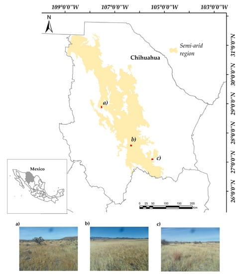 The study included three Permanent Monitoring Sites (PMS), which belong to the National Livestock Oriented Land Monitoring System [51]. The first PMS is called ‘Teseachi’, located at the central coordinates 28°53′35″N, 107°26′49″W; the second PMS, called ‘El Sitio’, is located at 27°35′17″N, 106°16′30″W; the third PMS, called ‘Eden’, is located at 27°06′50″N and 105°26′46″W (Figure 1). Each PMS is composed of nine monitoring stations, where biomass sampling was carried out once a year. The three PMS are located in the semi-arid region of Chihuahua, where the vegetation is dominated by grasses. Besides the grasslands, this region also houses chaparral vegetation and dunes [52]. Grasslands provide habitat for wildlife, serve as reservoirs of carbon, and help mitigate global environmental change impacts [53]. In these ecosystems, it is possible to find mammals, such as Bison bison and Cynomys ludovicanus, which have multiple effects on grasslands, and both of them are considered key in maintaining grassland habitats [54]. In addition, mammals such as Puma concolor can also be found, which is in a decreasing status based on the International Union for Conservation of Nature (IUCN) red list [55].