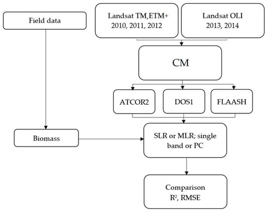 A visual analysis of false color compositions was performed to compare the correction methods (CMs). Statistical analyses included an ANOVA and a means comparison of the spectral signatures per band, carried out in the software SAS© (v.9.1.3). In addition, a simple linear regression (SLR) analysis was carried out between the values of each CM, separately per band, and the biomass. Moreover, a multivariate principal component (PC) analysis was performed. The components that explained at least 80% of the total variability of the reflectance values of each CM were selected. The accuracy of the CMs was determined by SLR when only one main component was selected and by multiple linear regression (MLR) in the cases when two or more components were selected. In any case, the coefficient of determination (R2) and the root mean square error (RMSE) were quantified to find the CM that best fitted the data of each year and each sampling site analyzed. Likewise, the p value served to determine the reliability of the CMs to estimate the biomass. A flow diagram explaining the methodology followed in this study is represented in Figure 2.