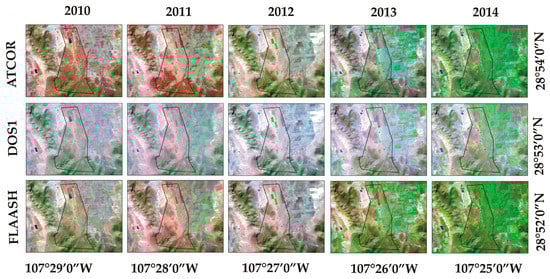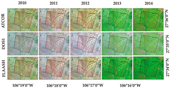 In a first analysis, the radiometrically corrected false-color images for Eden (years 2010, 2011, 2013, and 2014), as well as El Sitio and Teseachi (years 2010, 2011, 2012, 2013, and 2014), as is shown in Figure 3, Figure 4 and Figure 5, were visually compared. The correction methods were configured using the parameter of rural zone, which is a pre-calibrated value for zones not affected by urban zones or industrial activities [60].