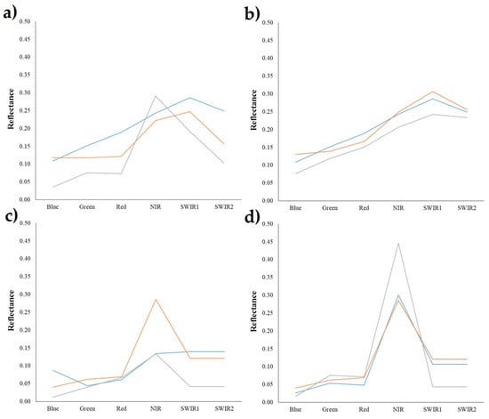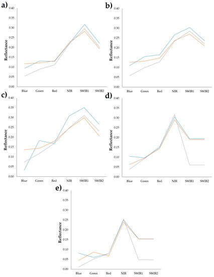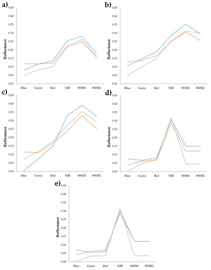 The reflectance means from the three PMS, obtained after applying the CMs for the period 2010–2014, were compared (Figure 6, Figure 7 and Figure 8). The differences among the CMs in general varied. The spectral signature of the grassland showed low reflectance values for the bands blue, green, and red during the studied period. Conversely, high values of reflectance were obtained by the bands corresponding to the Near Infra-Red (NIR) and Shortwave Infra-Red (SWIR) regions for the three PMS. That was possibly due to a strong chlorophyll absorption.