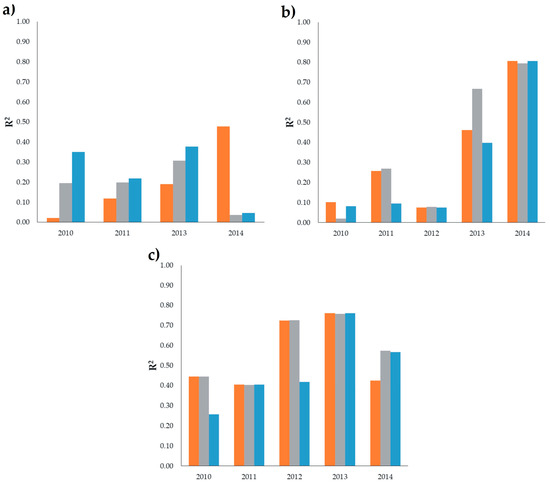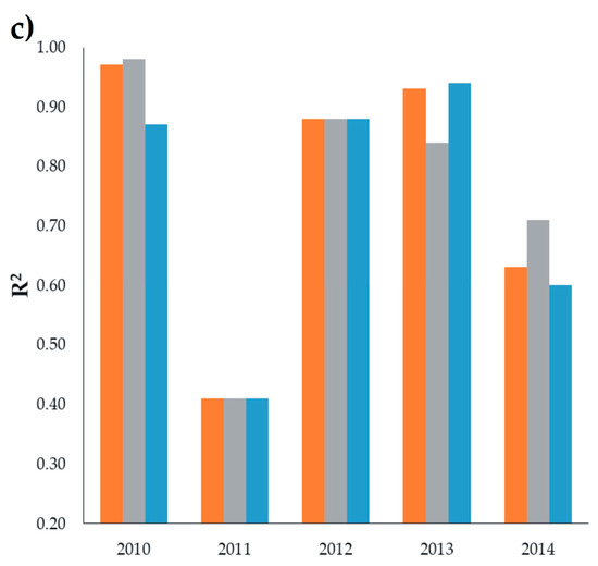 Table 2 shows the accuracy of the biomass estimation during 2010–2014 when applying the CMs to the scenes of each PMS. Variability on the values of R2 are observed among all the years and CMs. The contribution of the spectral bands to each SLR model was calculated. The results showed that, in Eden, the bands were not good biomass estimators (p > 0.05) when used separately. For El Sitio, the results showed significant values of R2 (p < 0.05) for the NIR in 2014 for the three CMs. In Teseachi, a larger number of significant values of R2 (p < 0.05) were observed for the red region, NIR, and SWIR 2. Finally, in Teseachi, the NIR and SWIR are the most relevant spectral regions for the prediction of biomass.