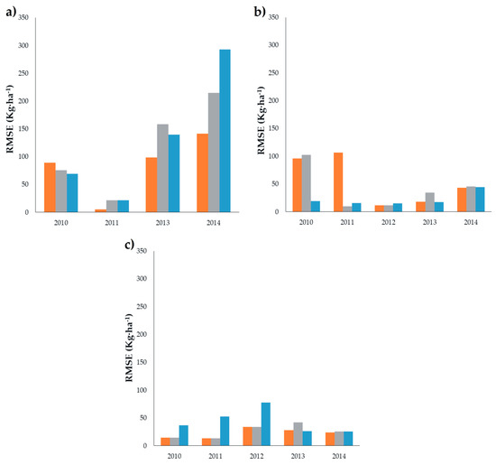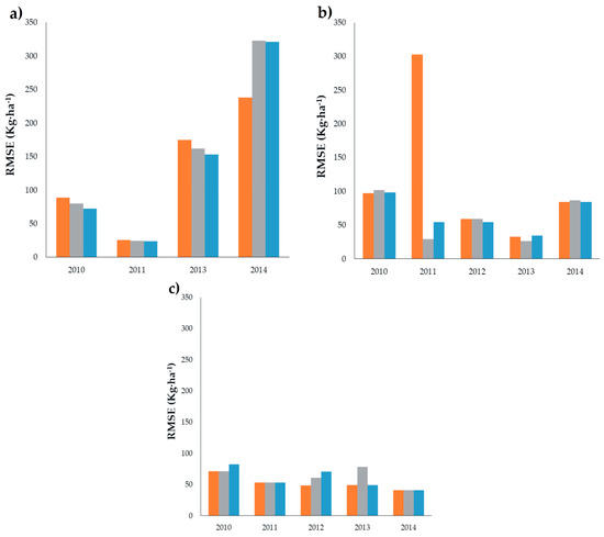 Variation in the precision of the correction methods represented by the RMSE (kg·ha−1). Eden (a); El Sitio (b); Teseachi (c); ATCOR2 (