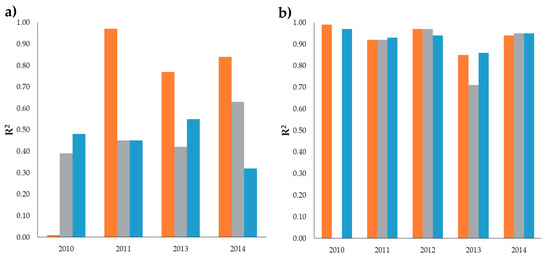 The correlations between biomass production and the spectral data obtained the highest values when the bands of red and infra-red were employed. In contrast, the relationships between biomass and the spectral values of the visible region were weak, indicating the sensitivity of this spectral range to the atmospheric variation, which agrees with that reported by Roy and Ravan [77]. Thus, in the temporal estimation and quantification of biomass, the application of a method for radiometric correction is necessary to eliminate the temporal variability. For most of the studied years, we found that FLAASH showed the highest reflectance values in the NIR. Such high values affected the relationships between biomass and spectral values. Previous studies have shown that high values of reflectance affect the estimations of biomass and the determination of potential areas for grassland production [69].