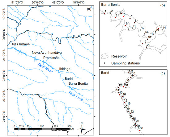 (a) Reservoir cascade system from the Tietê River, São Paulo State (Brazil), and the location of sampling stations in (b) Barra Bonita and (c) Bariri reservoirs.