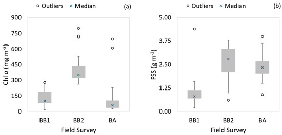 Boxplot of concentrations of (a) chl a and (b) fixed suspended solids (FSS) acquired in BB1, BB2 and BA.