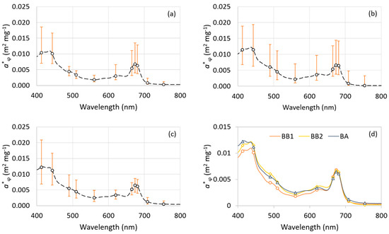 Average specific-chlorophyll absorption coefficient, a*φ, measured, with minimum and maximum, collected in (a) BB1; (b) BB2 and (c) BA; and (d) comparison of the average a*φ for the three field surveys.