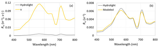 Comparison between (a) average Rrs and u spectra, both simulated via Hydrolight and between (b) average Rrs spectra simulated by Hydrolight and modeled from u and γ.