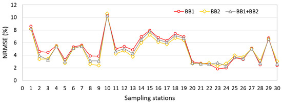 Normalized root mean square error (NRMSE) between simulated and modeled Rrs calculated considering the 11 bands for each sampling station from BA reservoir, obtained from the semi-analytical algorithm parameterized for both BB1 and BB2 datasets.