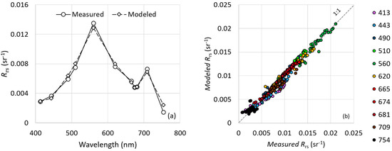 Optical closure between (a) the in situ measured Rrs and modeled Rrs from the semi-analytical algorithm applied to retrieve chl a concentration in point 3/BA. Scatterplot of (b) measured and modeled Rrs, considering every band (nm) individually.